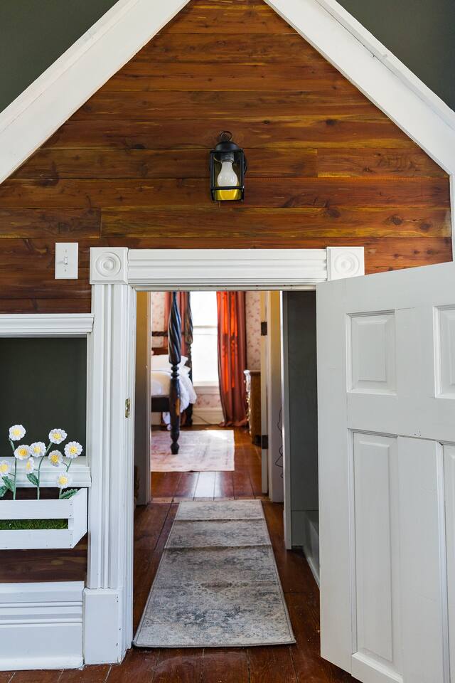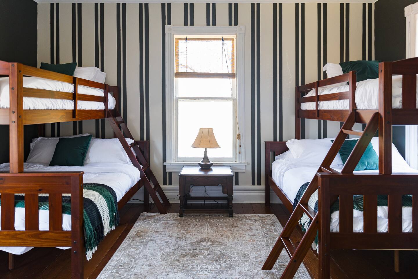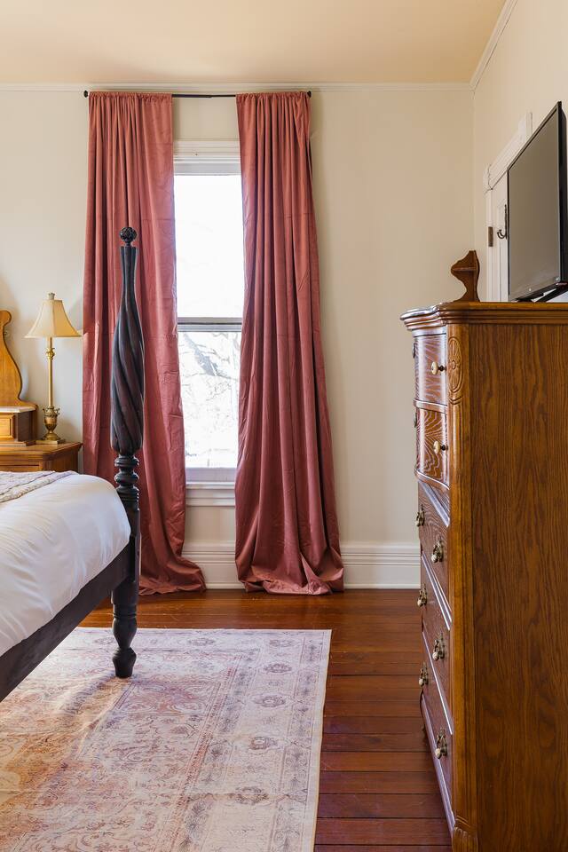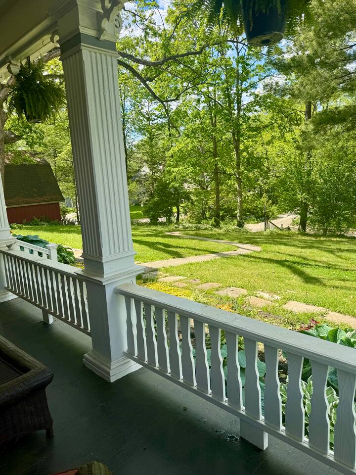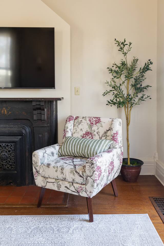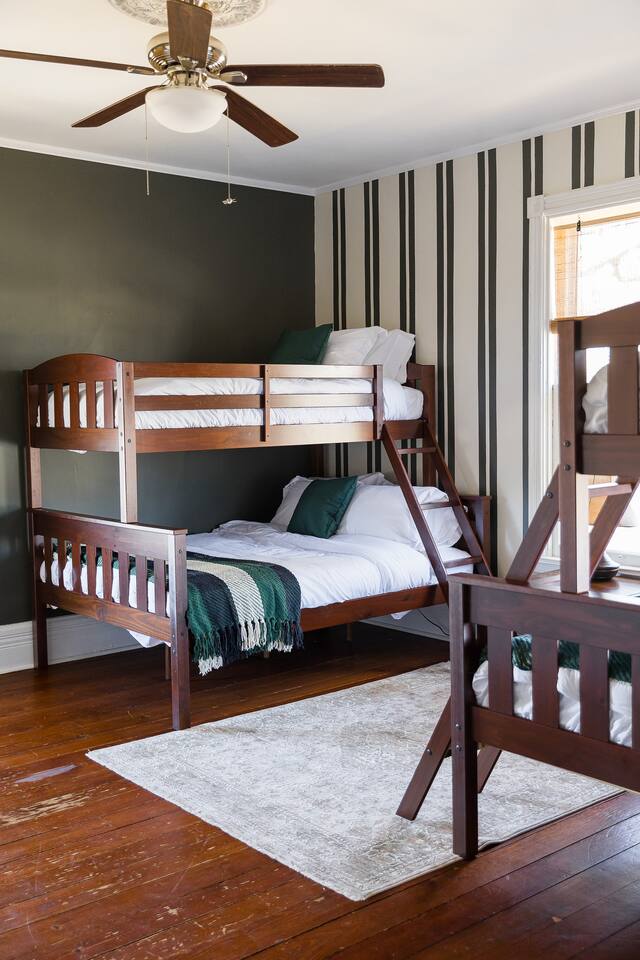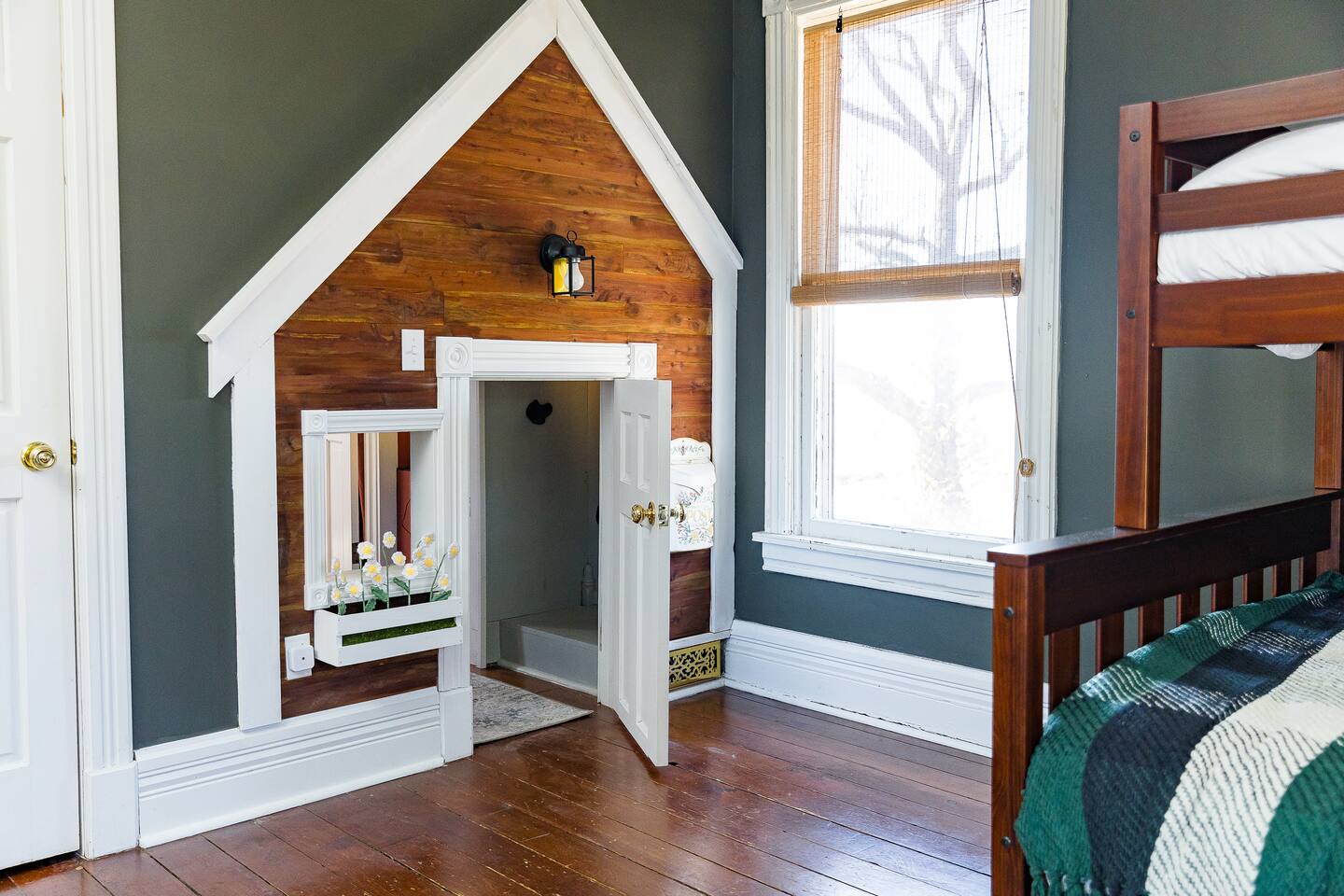 Originally part of a sprawling 40-50-acre estate “out in the country,” the home now combines historic charm with modern conveniences, making it the perfect retreat for families and groups. **Your Space to Relax and Create Memories** Rose Hill is designed for family fun and connection, comfortably accommodating up to 14 guests with: • Three Upstairs Bedrooms & Sunroom: • Master Bedroom: A serene retreat featuring a king-size four-poster bed, plush linens, rose-patterned wallpaper, velvet drapes, and abundant natural light. • Second Bedroom: Two queen beds, a smart TV, and a closet with a stackable washer/dryer. • Bunk Room: Two twin-over-full bunk beds, a built-in playhouse with a rock-climbing wall, floor pillows, a mini retro gaming system, and its own small smart TV—a dream space for kids! • Sunroom: A cozy spot that sleeps two, with a game table perfect for checkers, chess, or backgammon. Cozy, Nostalgic Charm Meets Modern Entertainment • Parlor: A treasure trove of board games, puzzles, books, and a convertible game table for poker and bumper pool. • Living Room: A spacious, inviting space with 12-foot ceilings, a non-working original fireplace, and French doors leading to the side patio. Gather here for movie nights, games, or a cozy read. • Dining Room: Features a large table that seats 8, a historical brass chandelier, and built-in shelving that wraps around original French doors leading to the side patio—a perfect space for shared meals and family conversations. A Kitchen with Heart The galley-style kitchen retains its original tile and is paired with blue-and-cream French toile wallpaper for a timeless feel. Nostalgic touches like antique glassware evoke the warmth of Grandma’s house. The kitchen connects to: • A charming bathroom with a walk-in shower and vintage tile. • A sunroom leading to a deck with built-in seating, custom pergola, HOT TUB, and new privacy fence. Gas BBQ grill also provided. Outdoor Fun & Privacy The outdoor areas at Rose Hill are continually being improved and upgraded to enhance your experience: • Front Porch: A welcoming space to relax and enjoy the neighborhood. • Side Patio: A spacious concrete area accessible from the dining room and living room, perfect for outdoor dining or lounging. • Back Deck: A private space connected to the sunroom, ideal for gatherings and enjoying the fresh air. Leads to Hot Tub with waterfall & color-changing lights! • Fenced-In Yard: Spanning half an acre, this large, private yard provides plenty of room for outdoor games, family fun, or simply soaking in the serene surroundings. Special Touches for Memorable Stays At Rose Hill, every detail is thoughtfully designed—from handmade quilts and candy dishes to velvet textures and floral prints. Whether you’re here for a weekend getaway, a family reunion, or a relaxing retreat, this home is sure to leave you with cherished memories. Book your stay at Rose Hill today and experience the perfect blend of historic charm, modern comforts, and heartfelt hospitality. We can’t wait to welcome you!